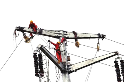 8月15日,在干江镇小屿门工业园区旁,国家电网电力施工人员正在铁塔和钢管塔上安装绝缘子串,为新建110千伏变电站架线作准备。