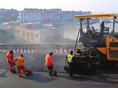 11月24日,在玉环市漩栈线干江镇栈头临海路段上,工人们正使用机械摊铺沥青底层。该“白改黑”路段长4.26千米,需摊铺沥青面层40750平方米,增设缆索护栏1384米,波形护栏提升1410米。至今,整个工程已完成60%左右。 吴达夫 摄