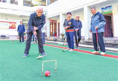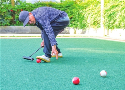 颜凤麟年轻时酷爱运动,最喜欢乒乓球和篮球,而门球的出现让他有了运动新选择。“门球是在平地或草坪上,用木槌击打球穿过铁门的一种球类游戏,不但规则简单、轻松有趣,还可以激发脑力、促进身心健康,非常适合老年人。”颜凤麟说。