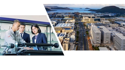 ▲干江滨港工业城小微园区。(干江镇供图) ◀玉环永兴村镇银行工作人员走访企业。(资料图)